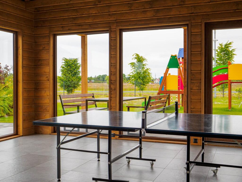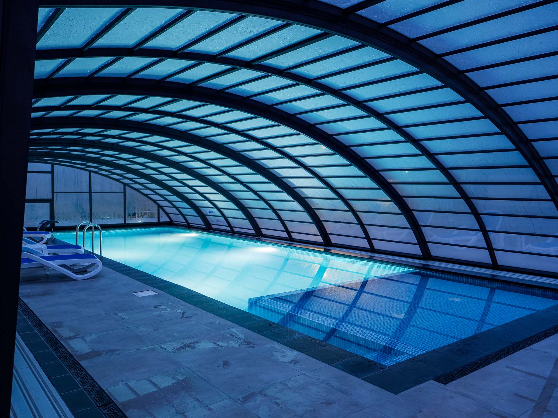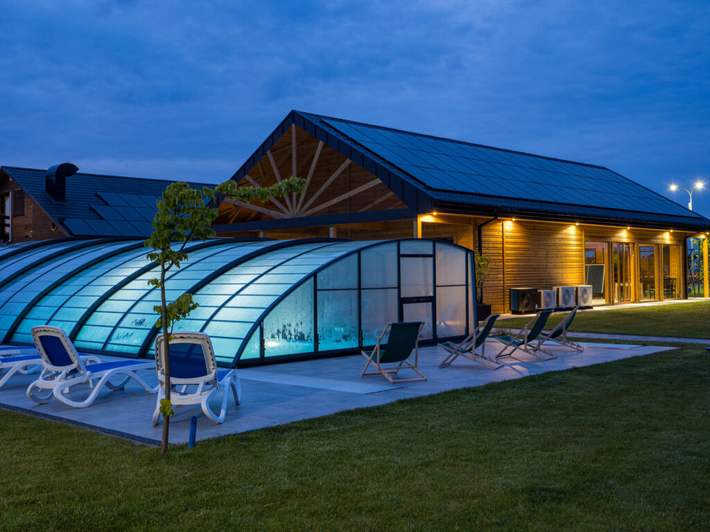 Kryty basen z podgrzewaną wodą i rozsuwanym zadaszeniem. Kąpiel w każdą pogodę.